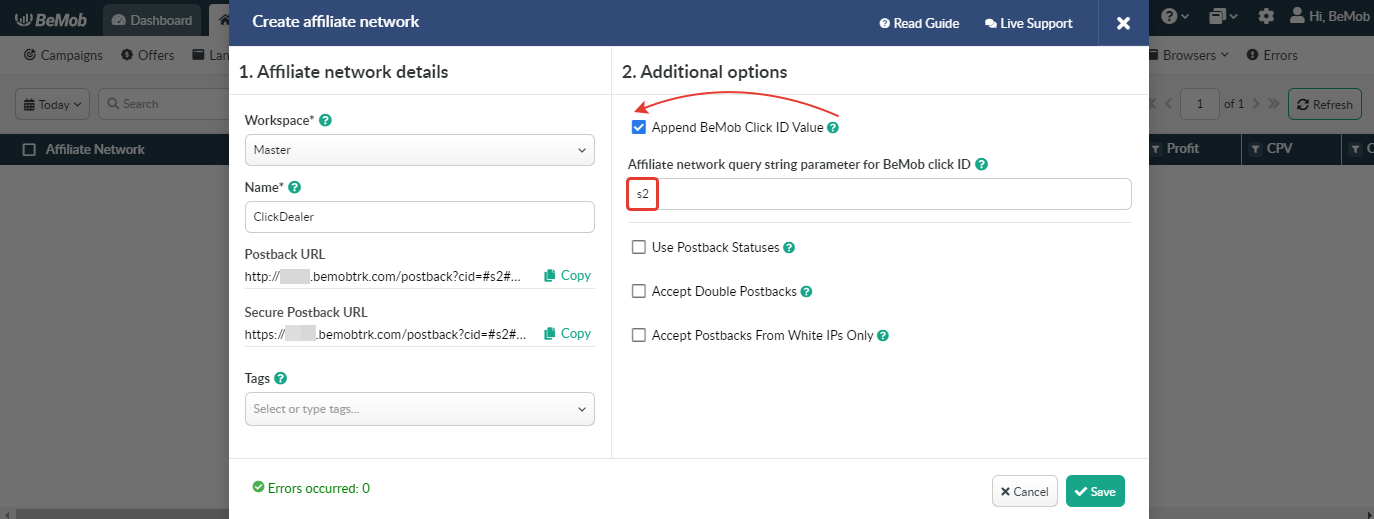 It is required to select either appending BeMob click ID automatically or manually in offer settings.