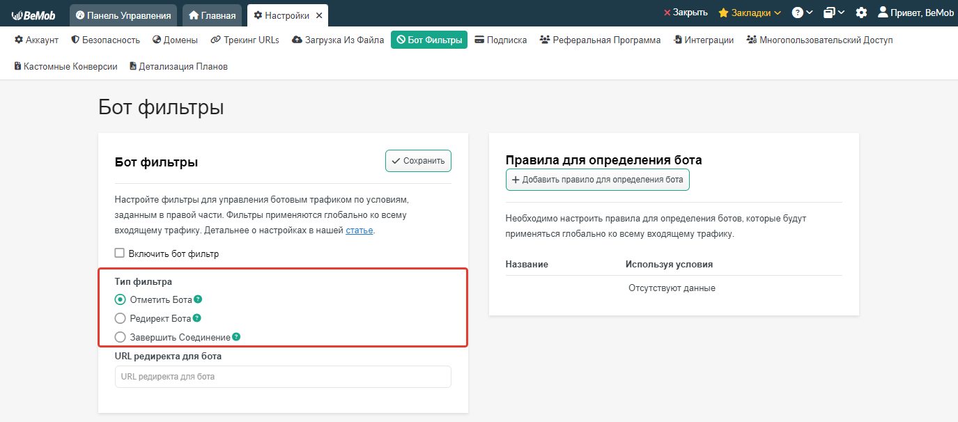 Чтобы настроить правило для определения бота, вам необходимо перейти Настройки → Бот Фильтры.