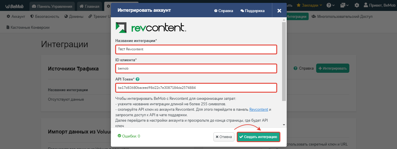 После того, как Вы скопировали ID клиента и API токен из Revcontent аккаунта, необходимо продолжить интеграцию на стороне BeMob.